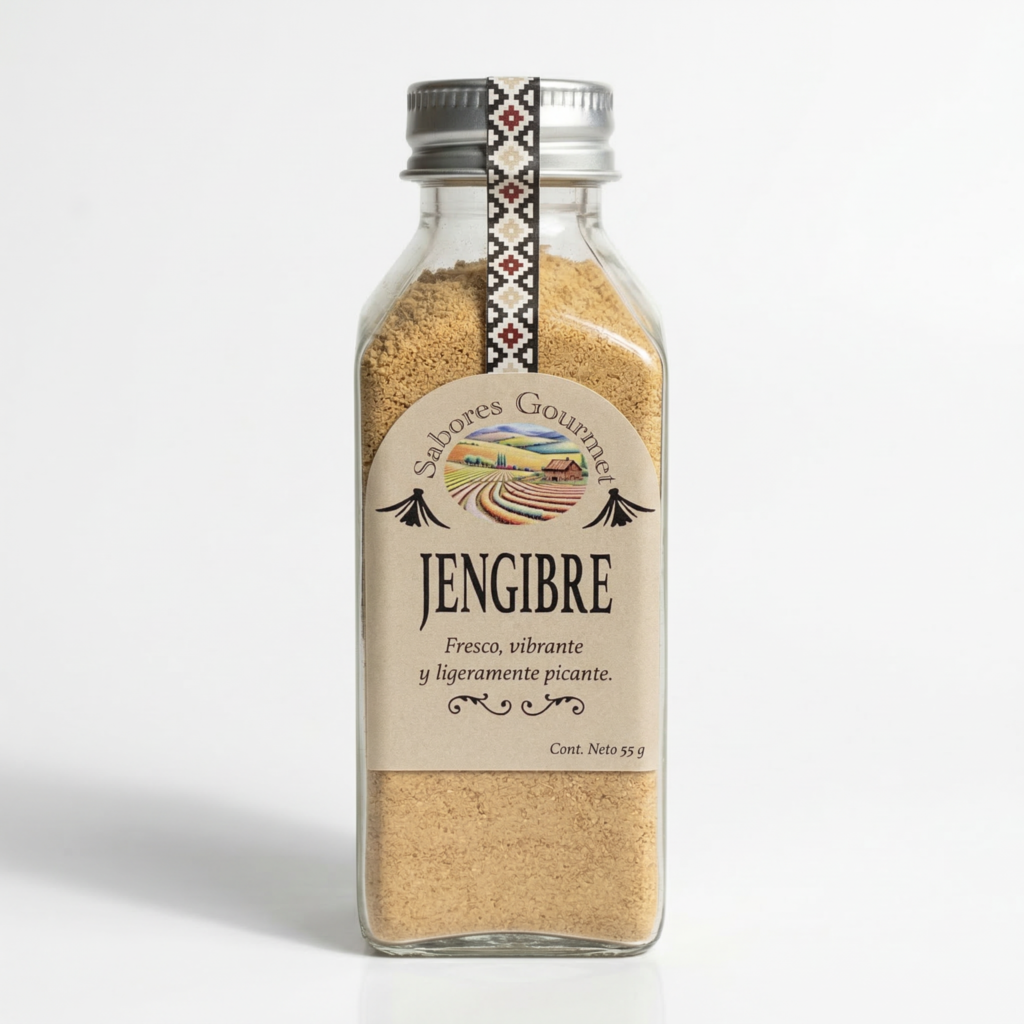 El jengibre es una especia aromática de sabor cálido y ligeramente picante, muy utilizada en la cocina asiática y en preparaciones dulces y saladas. Su aroma fresco y especiado aporta profundidad y un toque exótico a múltiples recetas.