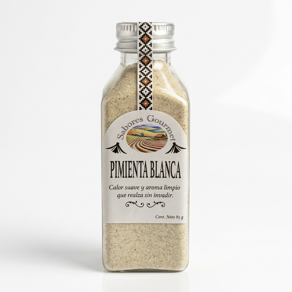 La pimienta blanca molida es una especia de sabor delicado y perfil refinado, obtenida a partir de granos maduros a los que se les ha retirado su cáscara. Su carácter suave y ligeramente picante permite realzar los sabores sin alterar el color de las preparaciones, siendo especialmente valorada en salsas claras y platos donde se busca equilibrio y sutileza.
